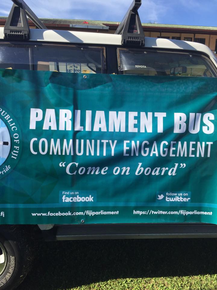 ‘Parliament Bus’ is our community connections flagship. This project is a travelling roadshow that visits communities across Fiji to inform them about parliament. Its message is: ‘Parliament Bus is coming, get on board’. This will reinforce the theme of parliament reaching out to people. Complementing this project is a series of ‘Meet the Speaker’ visits to communities as well as a range of community consultation projects to allow the community to voice their views to Parliament.